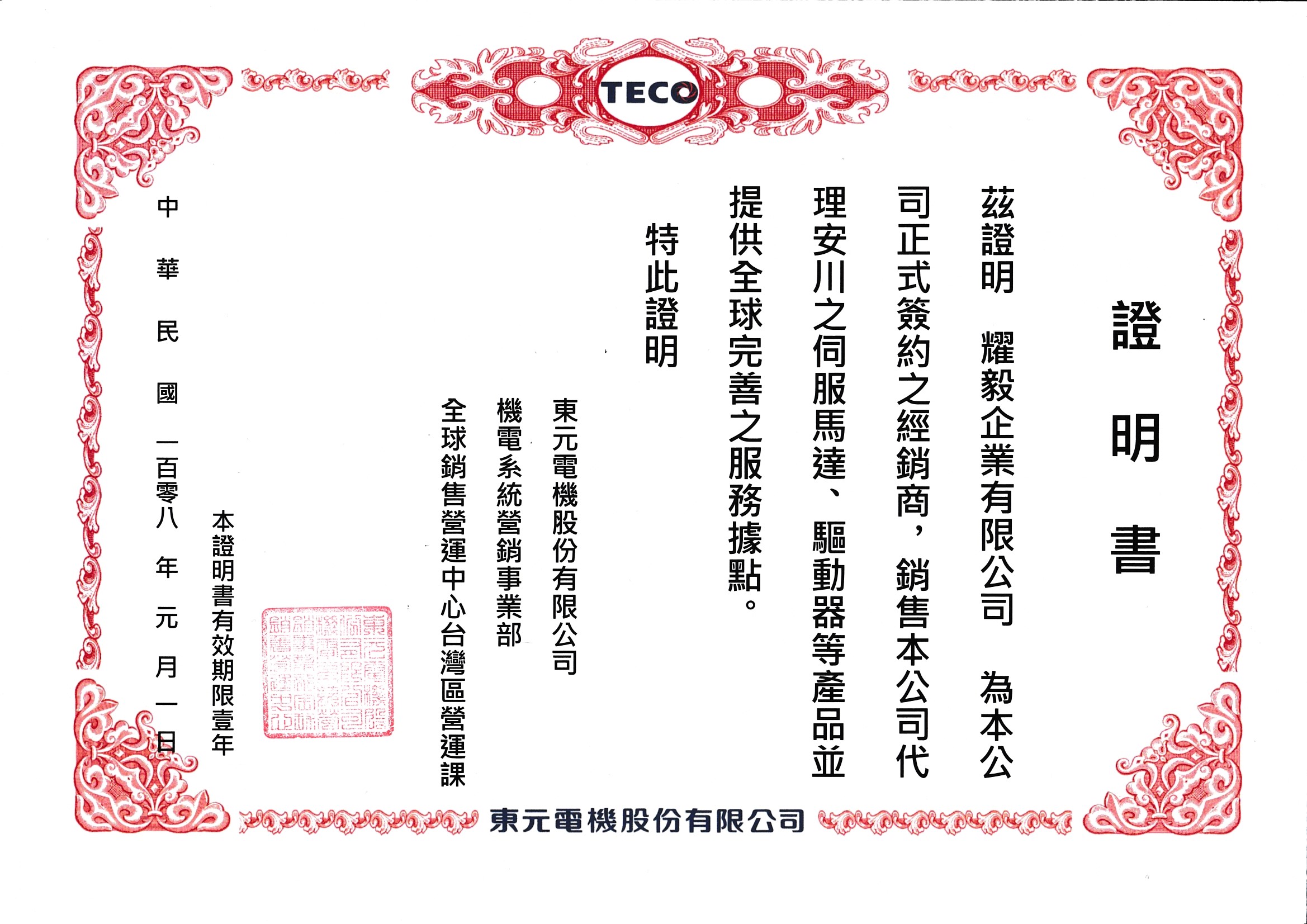 台灣地區代理證書-東元-伺服馬達/驅動器(2019)