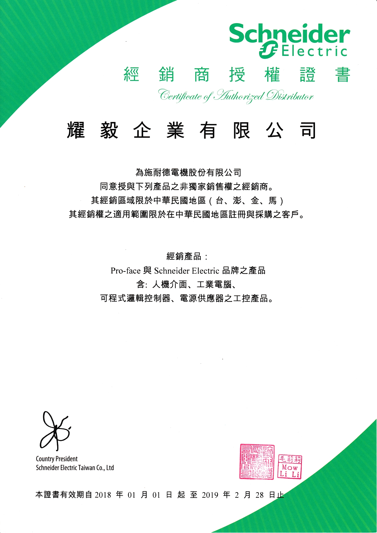 台灣地區代理證書-施耐德-人機介面(2019)