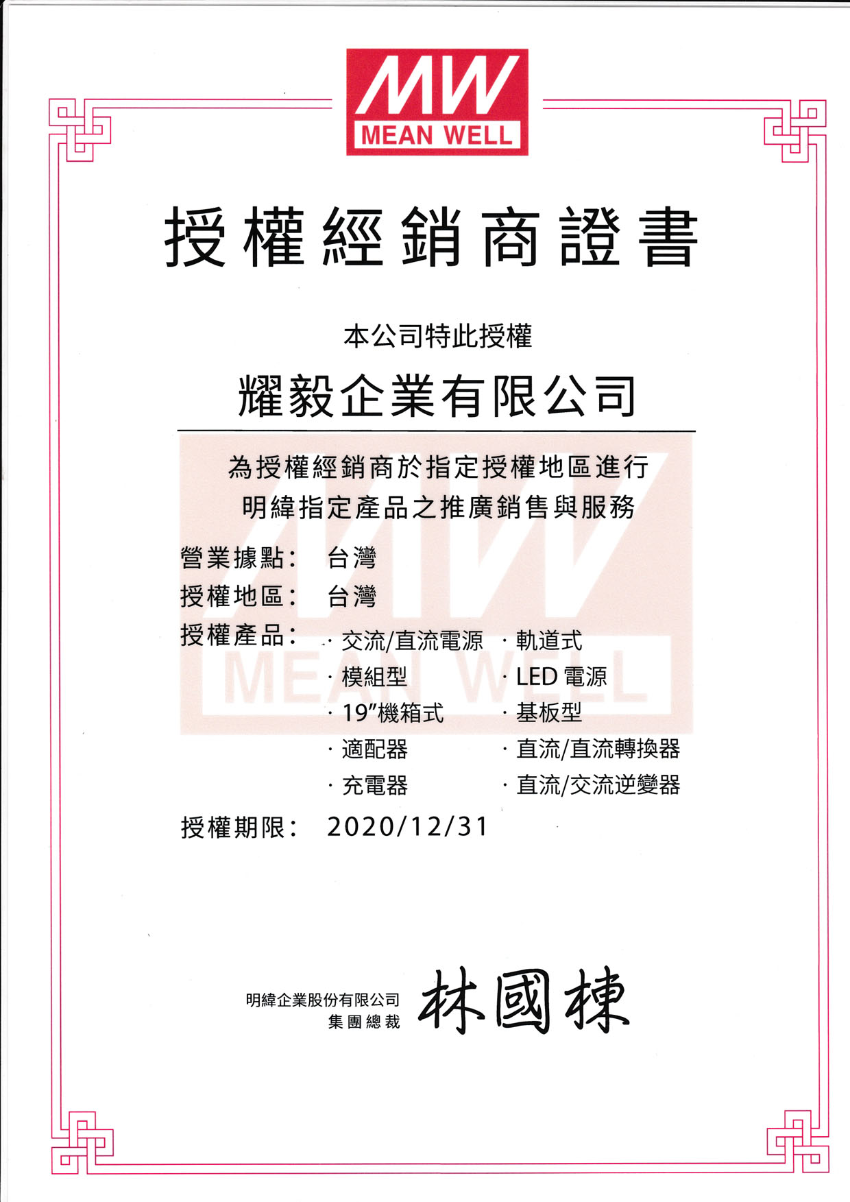 台灣地區代理證書-明緯-電源供應器(2019)