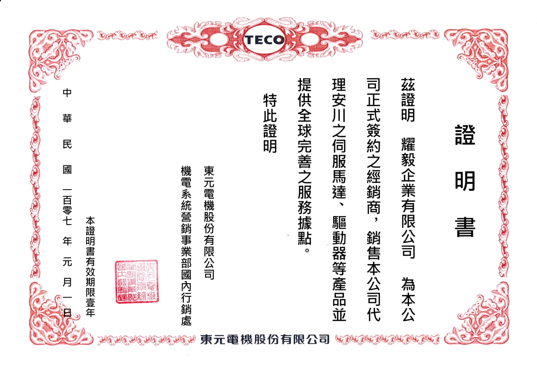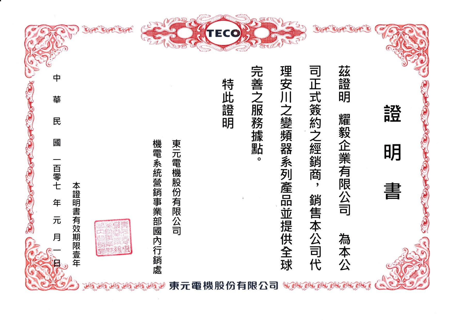 台灣地區代理證書-東元-變頻器(2018)